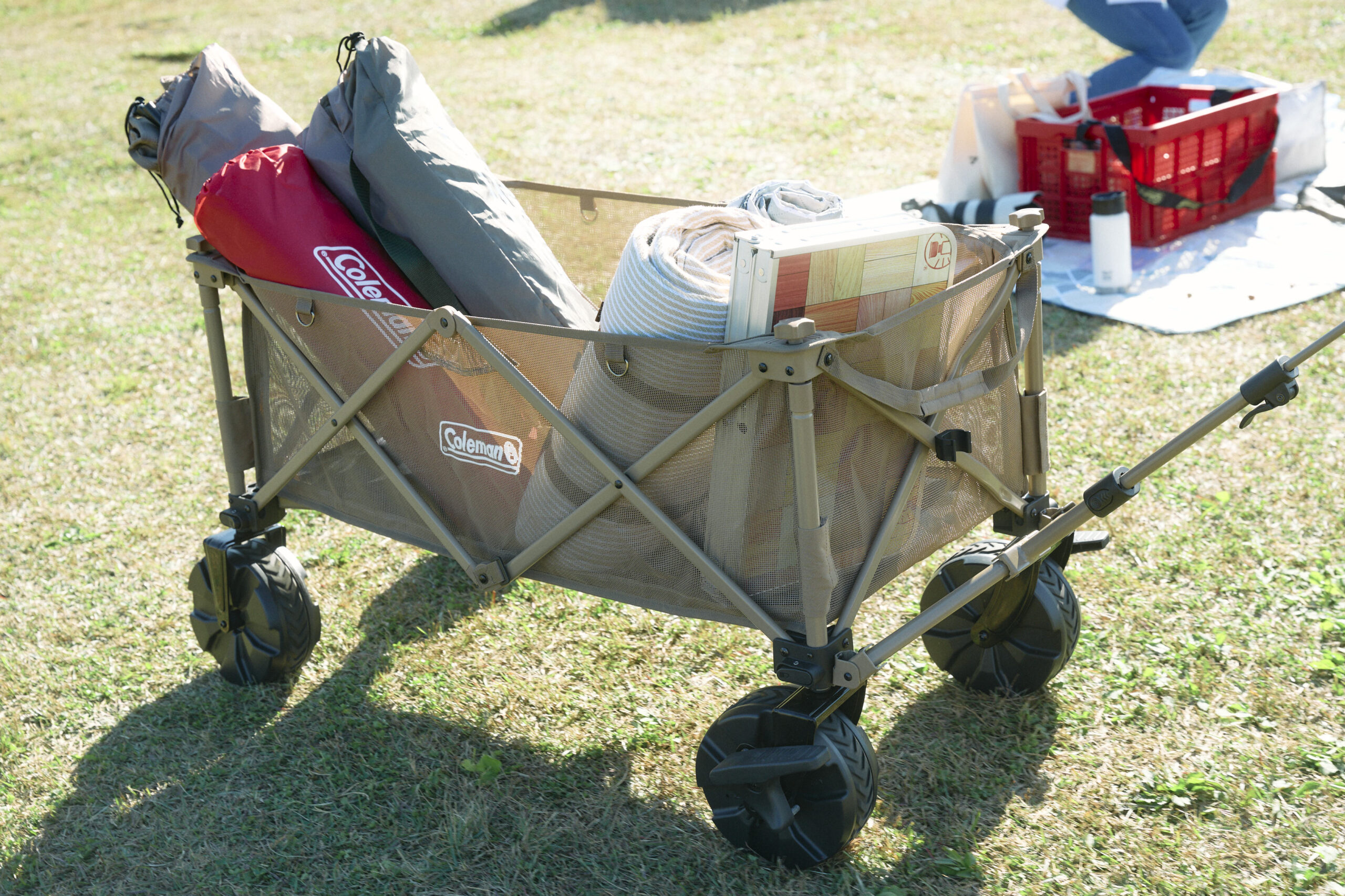 コールマンの「アウトドアワゴンマックス」は、大型タイヤで砂利道や草地でもスムーズに移動でき、段差がある場所でも安定感があります。通気性と排水性に優れたメッシュ素材を採用しており、雨に濡れてもすぐに乾くのもうれしいポイント。使用後は荷台を取り外して水洗いも可能です。