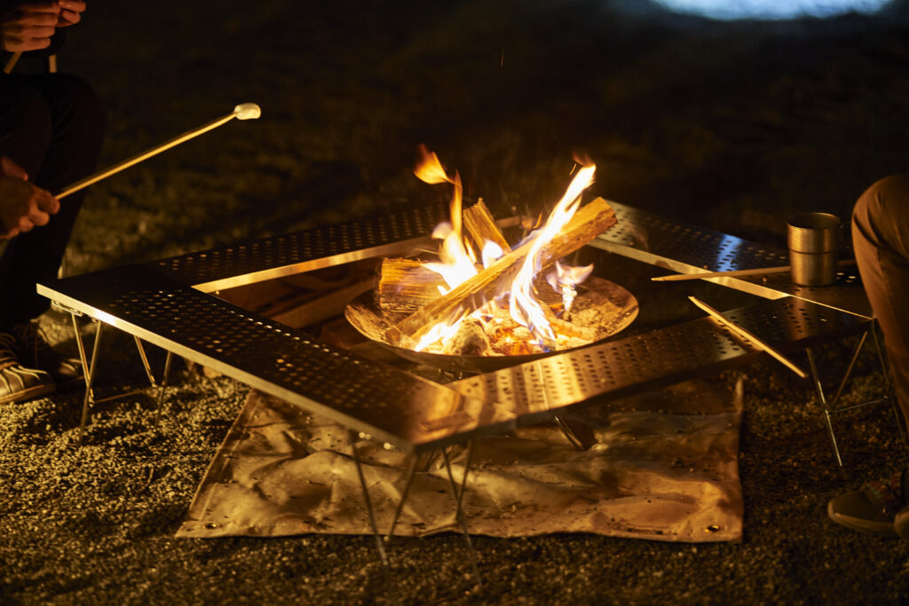 焚き火台や焚き火シートは、芝が燃えたり、土の中にいる微生物がダメージを受けたり、飛び火して火事になったりするのを防ぐ役割を持っています。焚き火台があったとしても地面への熱はかなり高温です。薪が崩れて地面に落ちることもあるため、焚き火シートも必ず準備しておきましょう。
