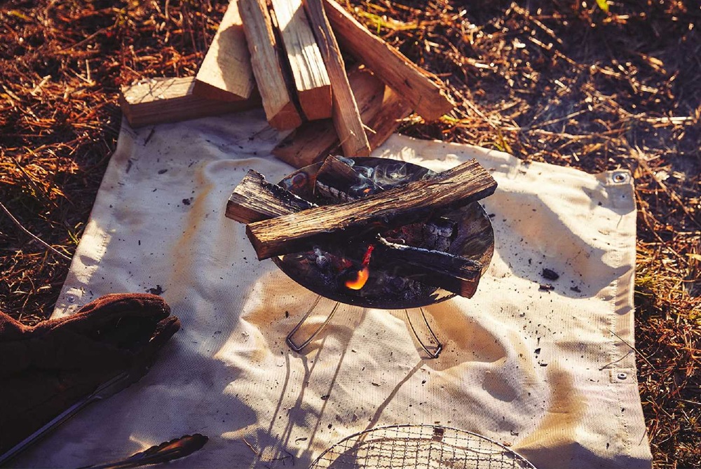 まずは焚き火台をセットしましょう。周囲に燃え移りそうなものがないか安全確認し、焚き火シートを敷いてから焚き火台をセットします。